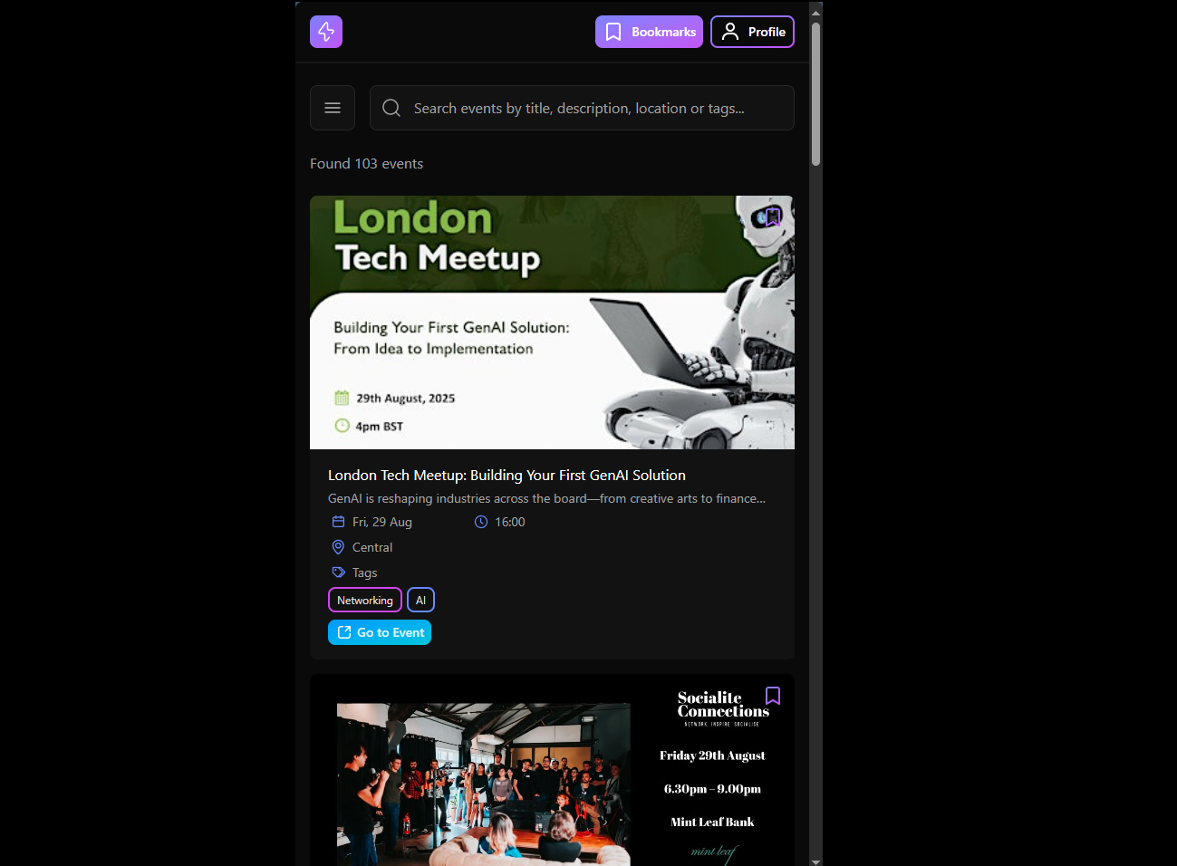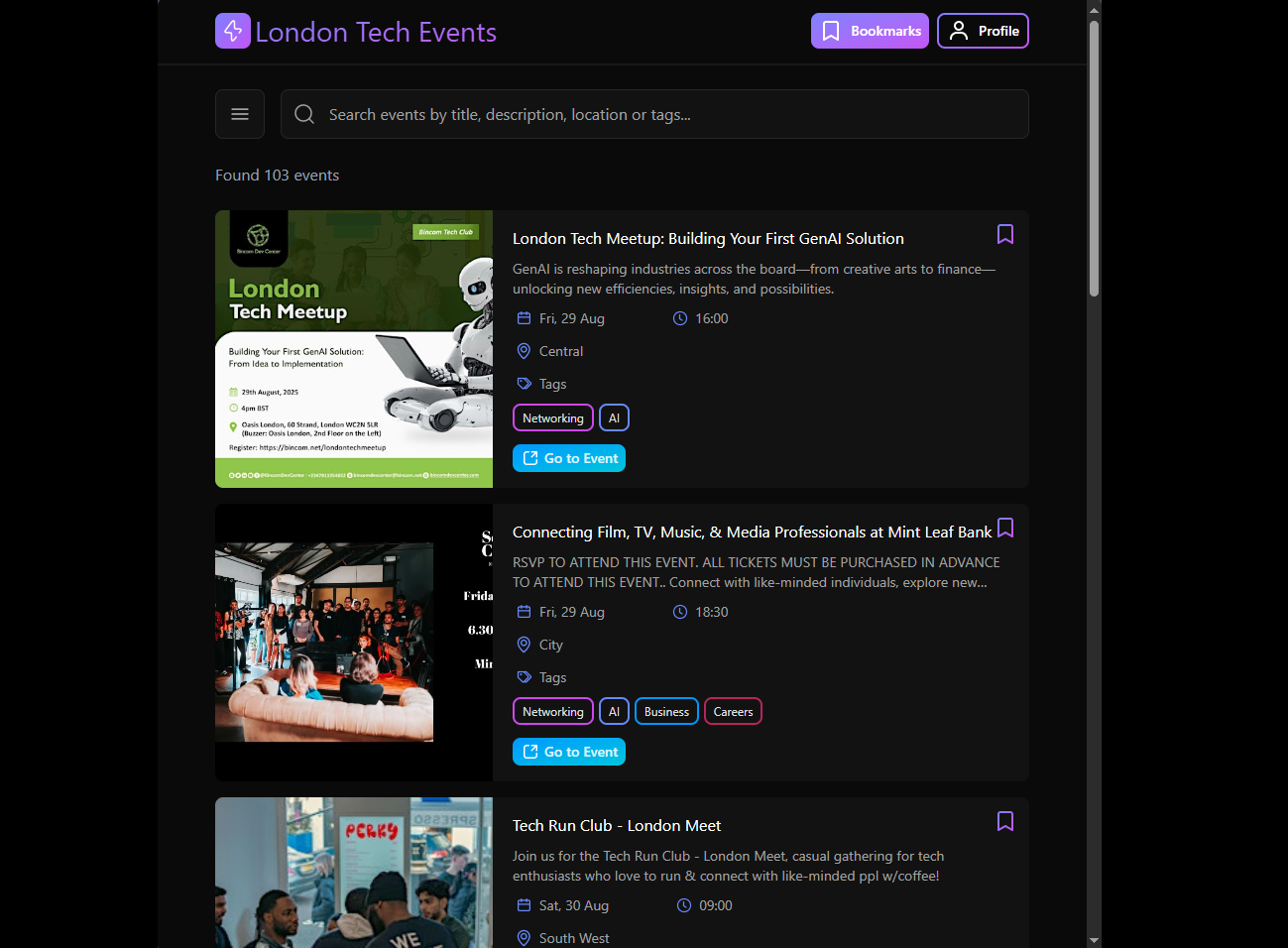 London Tech Events is a full-stack web application that aggregates, filters, and displays the latest tech-related events happening in London. It uses