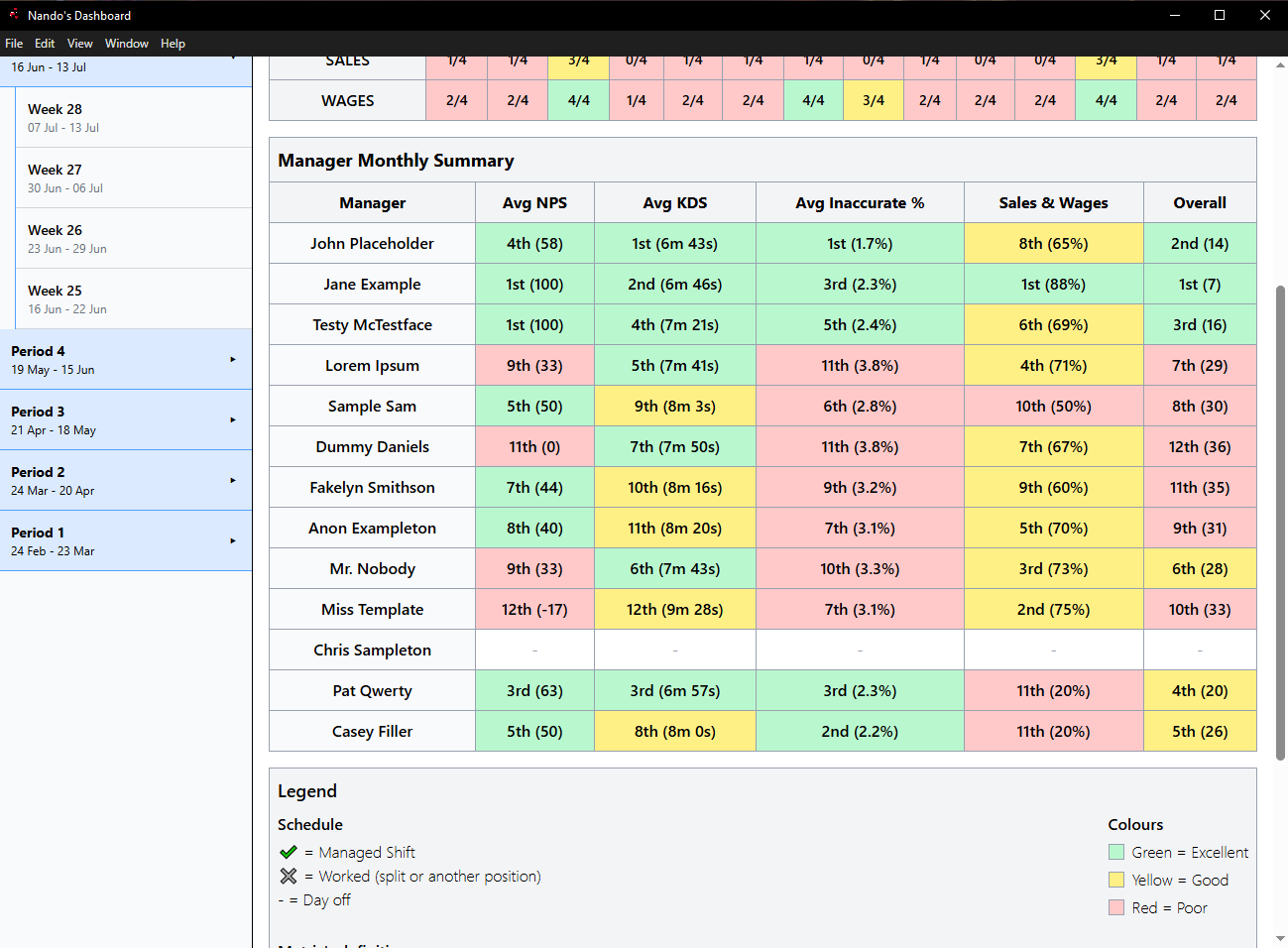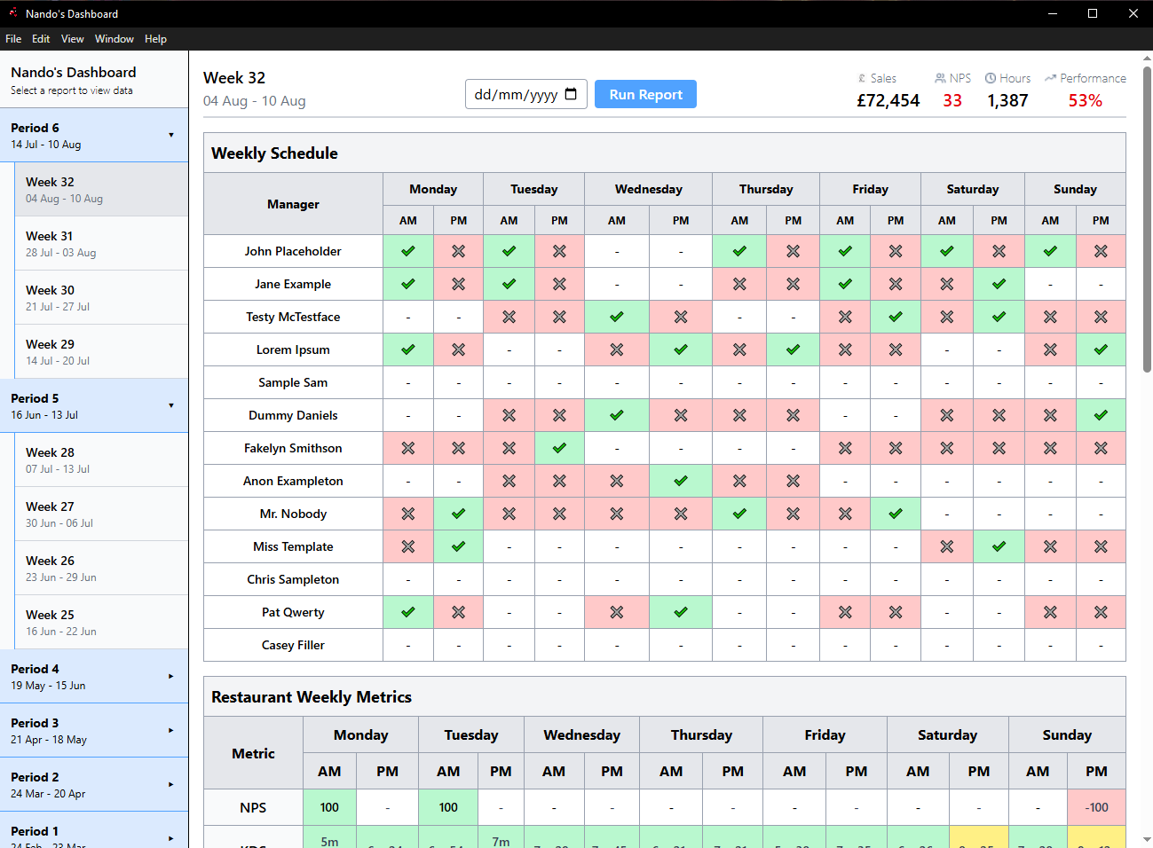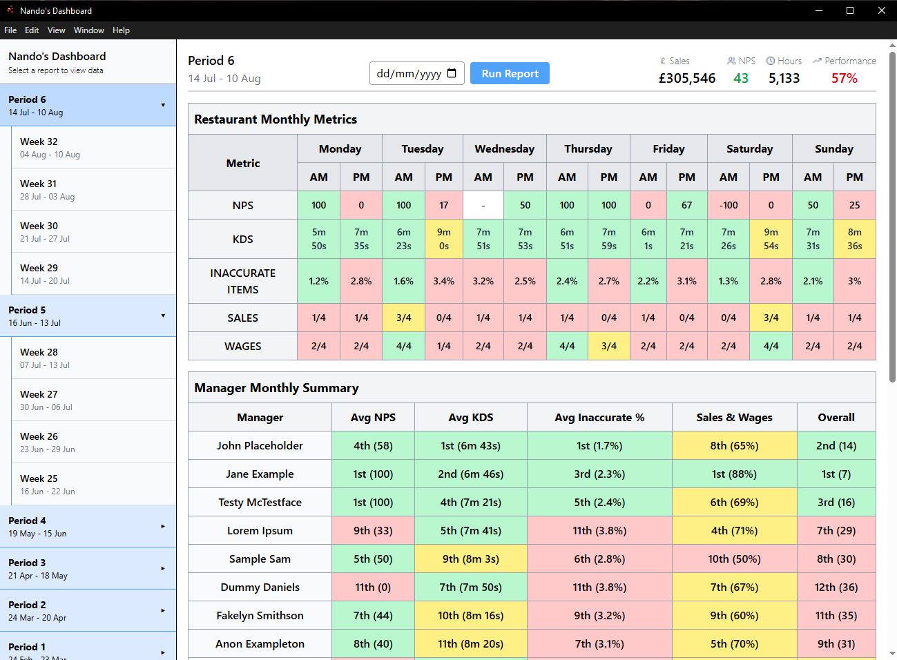 A custom web application built and deployed for use across multiple restaurants in the region, automating performance reporting for managers & the restaurant. Gathers weekly performance data (NPS, KDS, sales, inaccurate items, wages, etc.) from internal systems. Separates metrics by morning/evening shifts and generates both weekly and 4-week period reports. Includes manager performance tracking with rankings, pattern identification, and visual data tables. Saves store managers hours per week, improves accuracy, and enables data-driven decision-making.